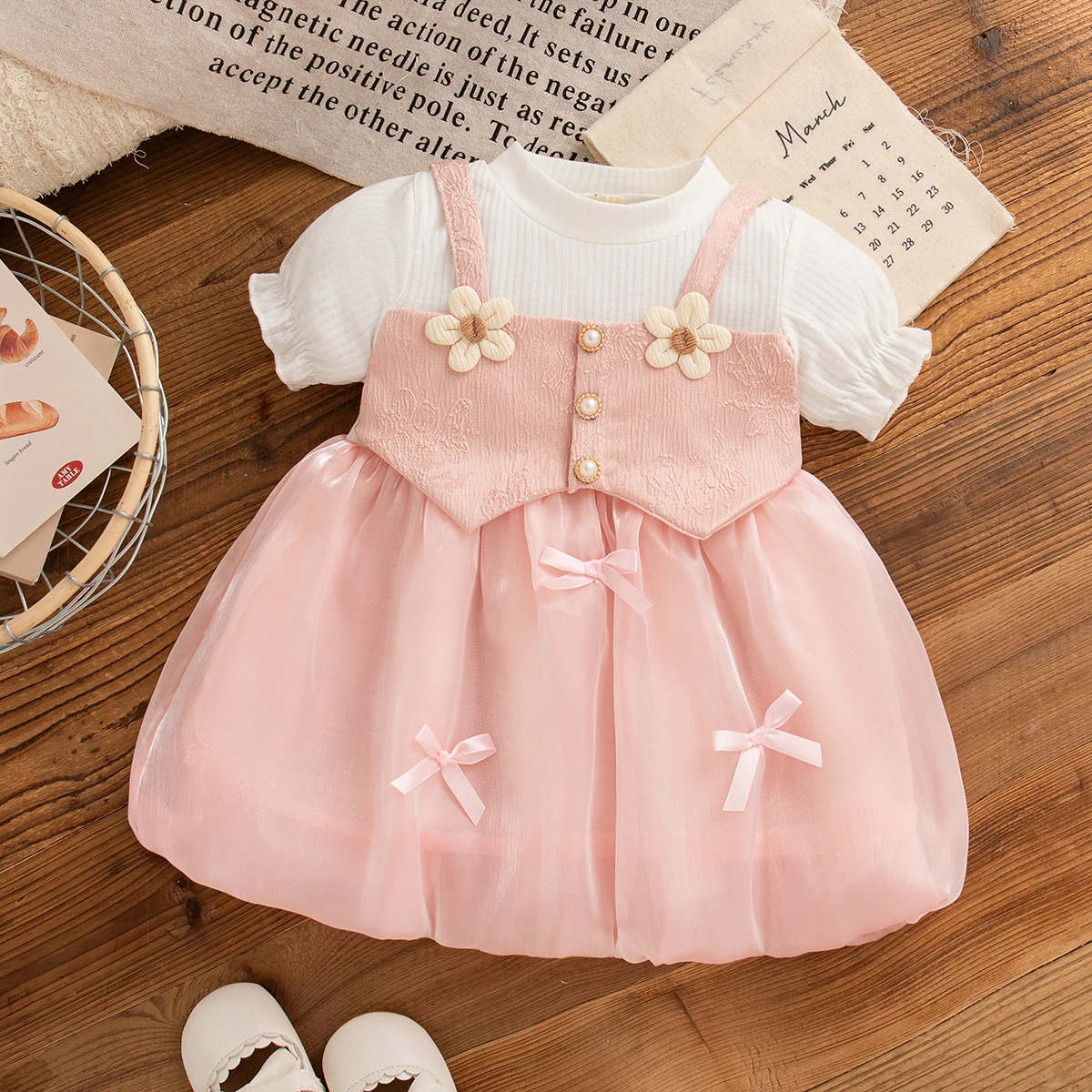 Toddler Dress Summer New Short Sleeved Baby Girl Dress Imitation Of Two Pieces Sweet Bow 3d Flower Girl Clothing